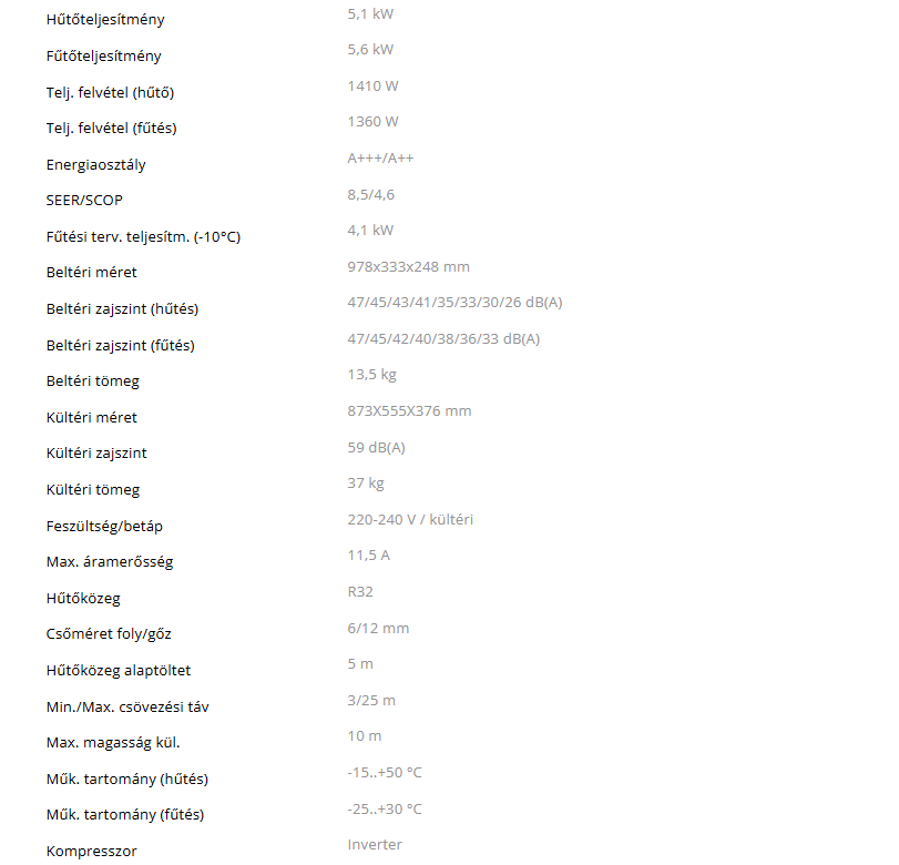 • Hűtő teljesítmény : 5,1 kW